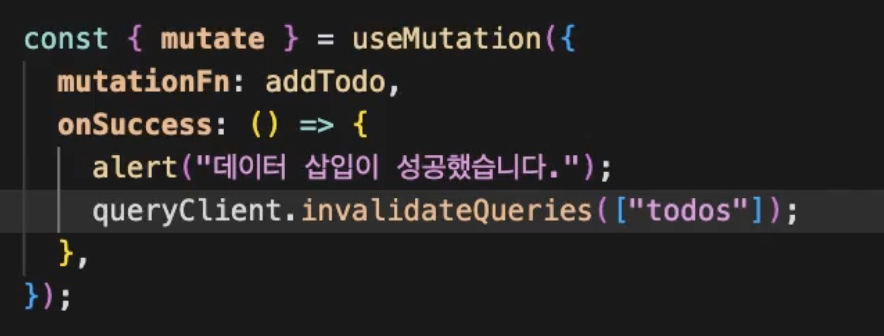 -> 쿼리키는 데이터를 캐싱하는 기준, 이제 이 쿼리키가 더이상 유효하지 않다고 처리해주면서 현재 서버의 todos로 클라이언트를 갱신해주는 것