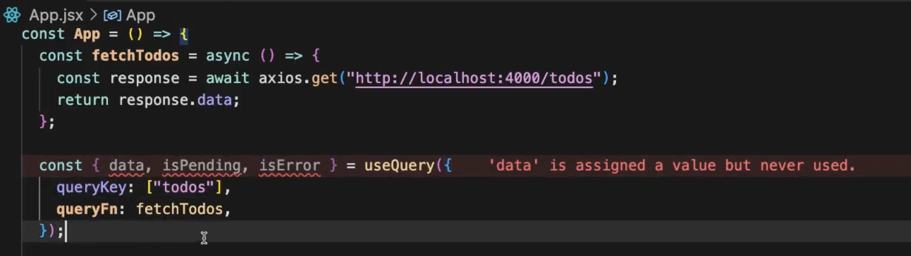 - 최초 상태에는 todos라는 Query Key에 아무 값도 저장되어 있지 않기 때문에 const { data } = useQuery~~ 의 data는 undefined가 됩니다.