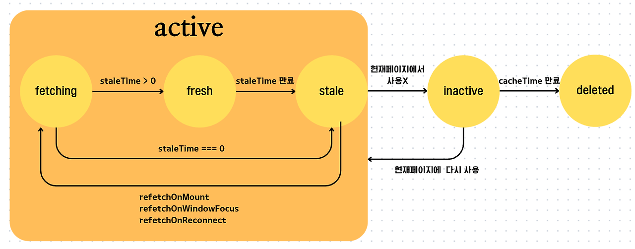 | fresh | 데이터를 새로 패칭할 필요가 없는 상태입니다. **staleTime**이 지나지 않은 상태로, 캐시 데이터를 그대로 사용할 수 있습니다. |
