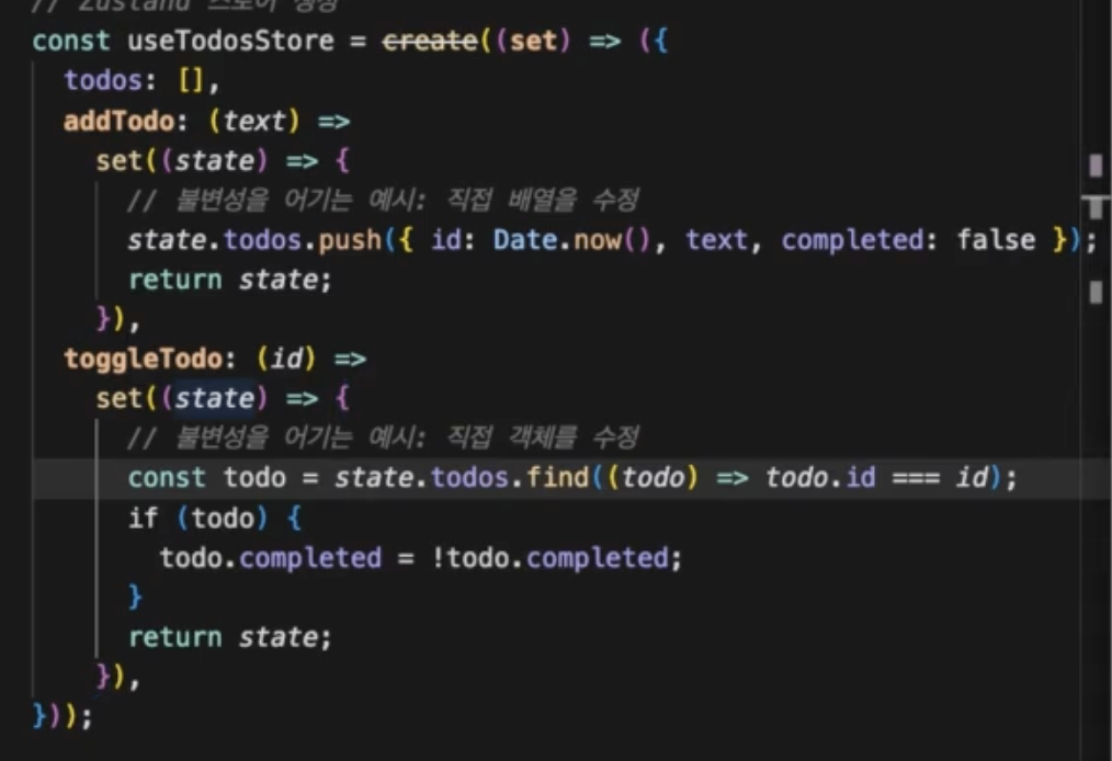 위 예시는 불변성을 어기는 예시로, 구조분해할당/map/filter 등 새로운 배열이나 객체를 반환하는 방법을 사용하는 방법과 immer를 활용하는 방법을 사용할 수 있다.