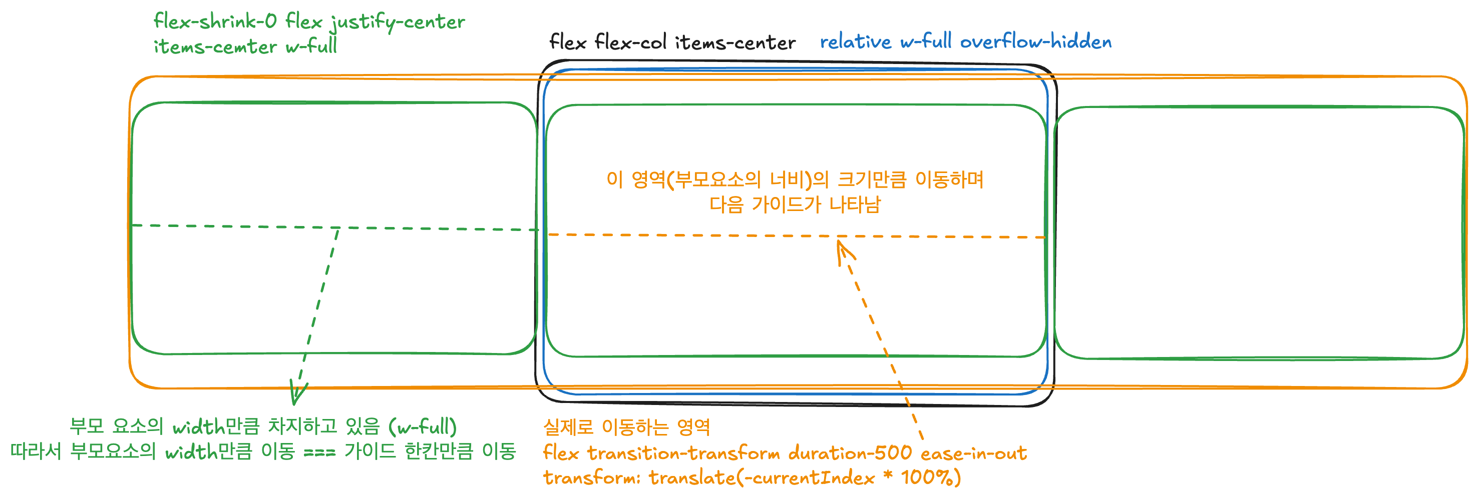 - 캐러셀 영역에서 보이지 않을 부분(현재 보여줄 가이드가 아닌 부분) 부모 요소에 overflow-hidden을 설정해 보이지 않게 함