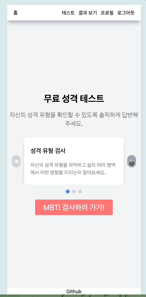 캐러셀!! 계속 구현해보고싶었는데 시간에 밀려 시도를 못해보다가 이번 MBTI 테스트 프로젝트를 만들면서 드디어 적용해봤다