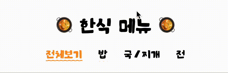 배열에있는 한식 메뉴들을 화면에 출력하는 과제를 진행하며, 카테고리를 나누고 선택하는 카테고리의 메뉴만 볼 수 있는 기능을 추가하고싶어 메뉴바를 만들어보았다.