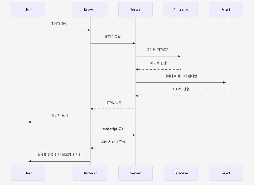 3) 서버는 필요에따라 database에 데이터를 요청하고, 그 데이터로 react를 실행해 html을 생성