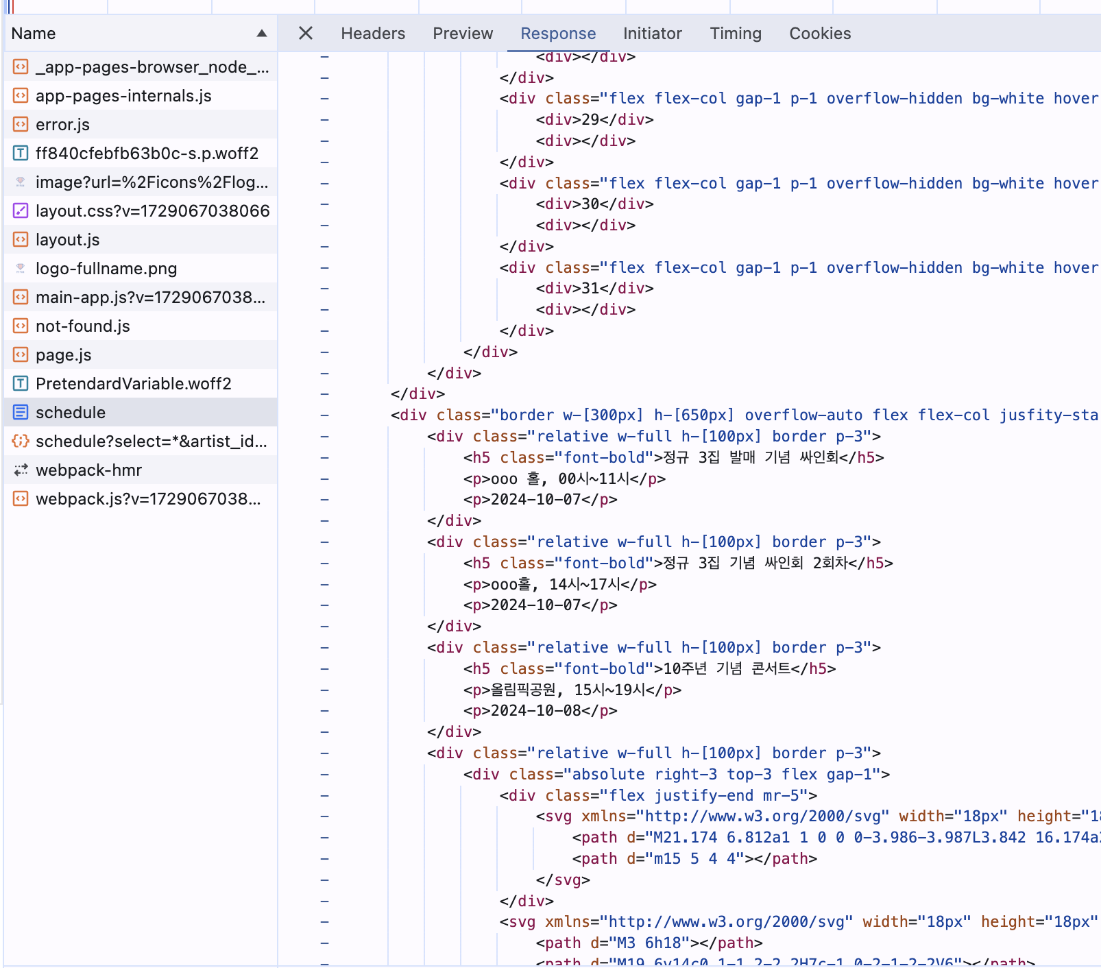 페이지를 받아온 후 fetch 요청을 한 결과가 아니라 schedule 페이지 요청에 대한 응답에 처음부터 포함이 되어있었다는 것이므로, prefetch가 잘 이루어졌다는 것을 확인할 수 있다
