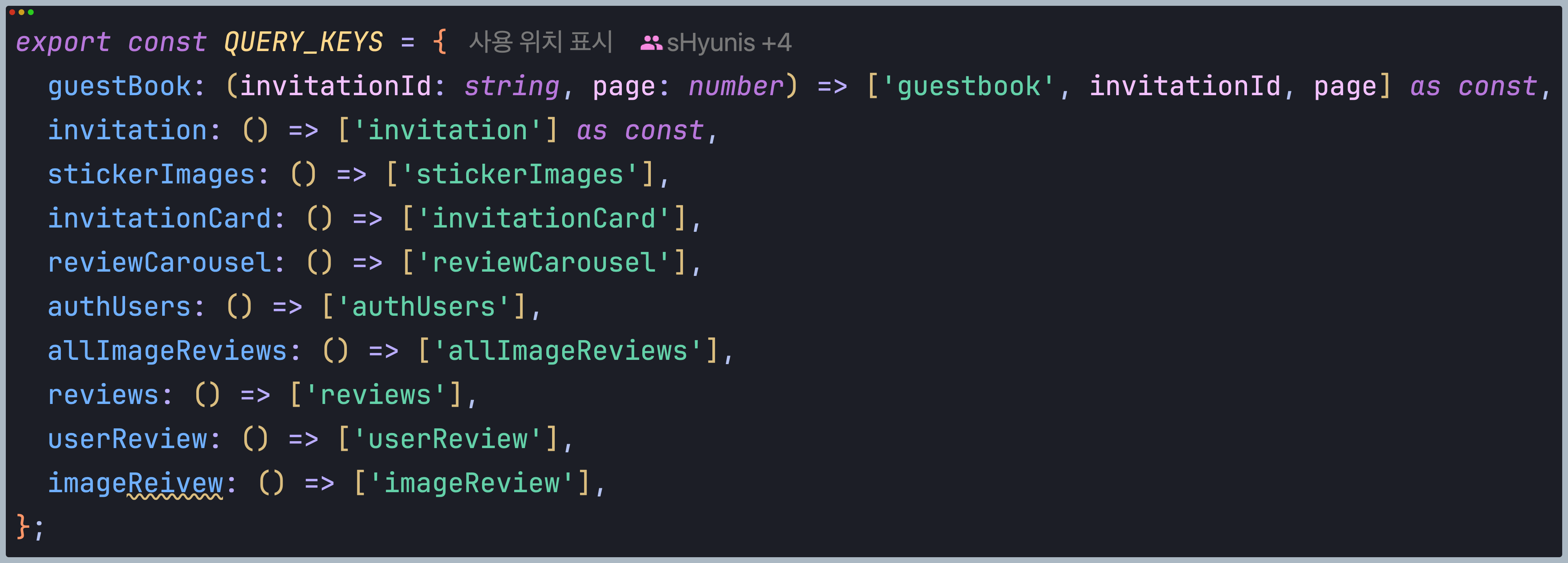 이 중 Tanstack Query의 쿼리키를 관리하는 컨벤션은 구현 과정에서 다른 데이터를 같은 쿼리키로 관리해 발생한 에러가 있어 도입한 컨벤션이었는데요. 사용하는 쿼리키를 한 파일에 모아 관리해 중복 위험을 줄이고, 동시에 쿼리키를 텍스트로 직접 입력할 때 발생할 수 있는 오타 등의 실수를 방지할 수 있게 되었습니다. 개인 프로젝트를 진행할 때도 활용할 수 있지만, 특히 여러 사람이 같은 데이터를 관리해야할 때 유용한 방식이라고 생각합니다.