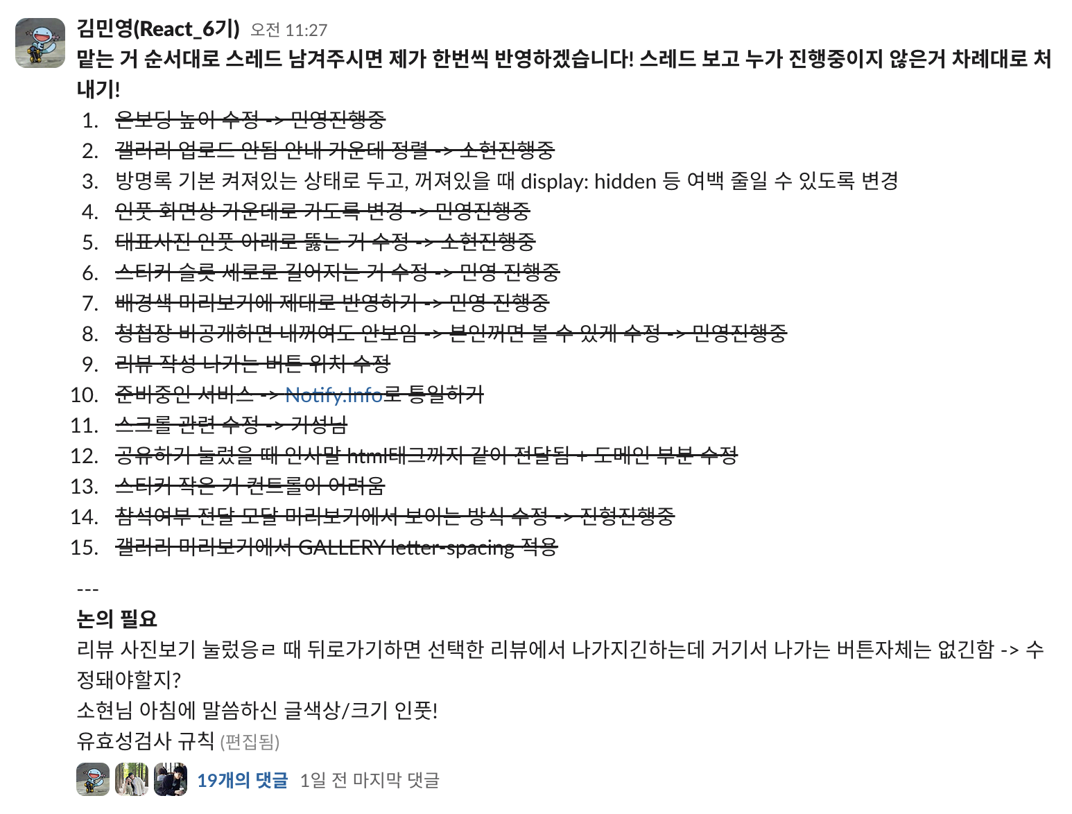 중간 발표 전 최종 수정사항을 정리하고 기존 담당과 관계없이 작업이 끝나는 순서대로 빠르게 남은 일감을 분담한 흔적입니다.