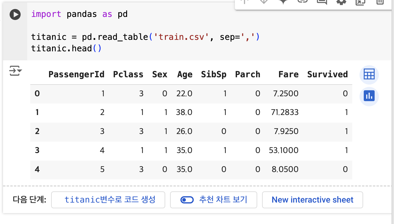 titanic = pd.read_table('train.csv', sep=',') # train.csv는 읽어올 파일경로