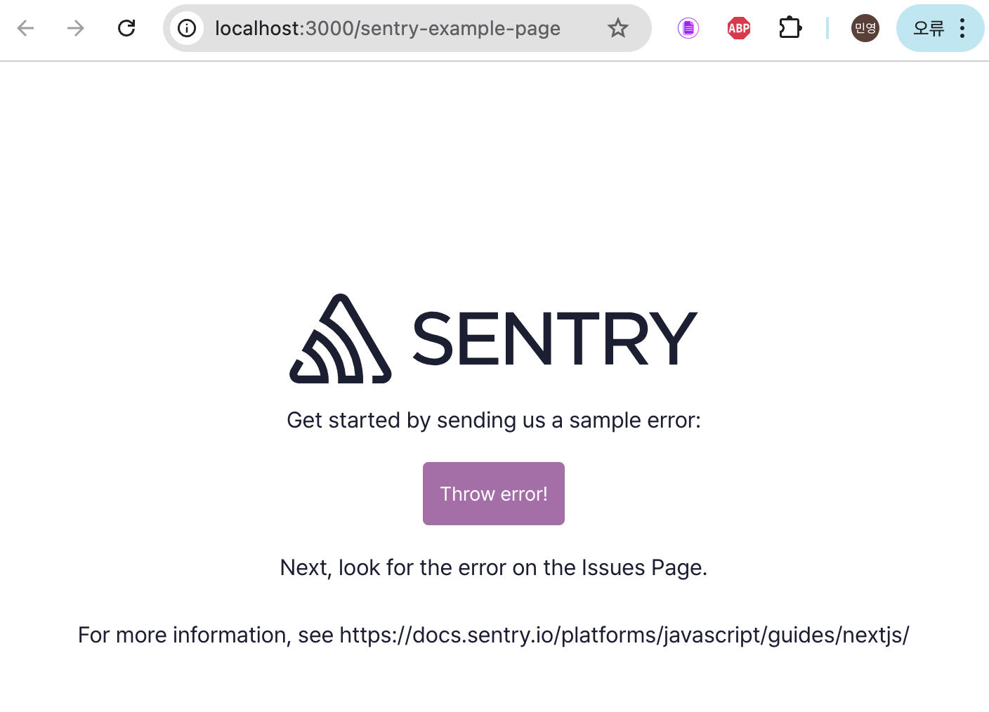 세팅이 잘 됐는지 확인할 수 있는 에러 페이지를 추가할 수 있는데, sentry-example-page 경로로 들어오면 있는 Throw error 버튼을 눌러준다.