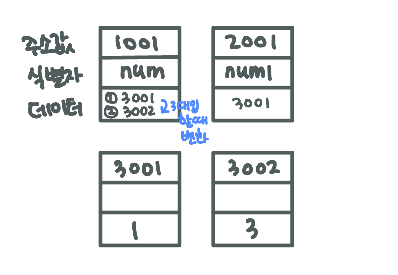 num2에 num의 값을 복사하기위해 num2 = num을 실행한 경우 num2은 마찬가지로 1이 저장된 주소값(3001)을 갖게된다.