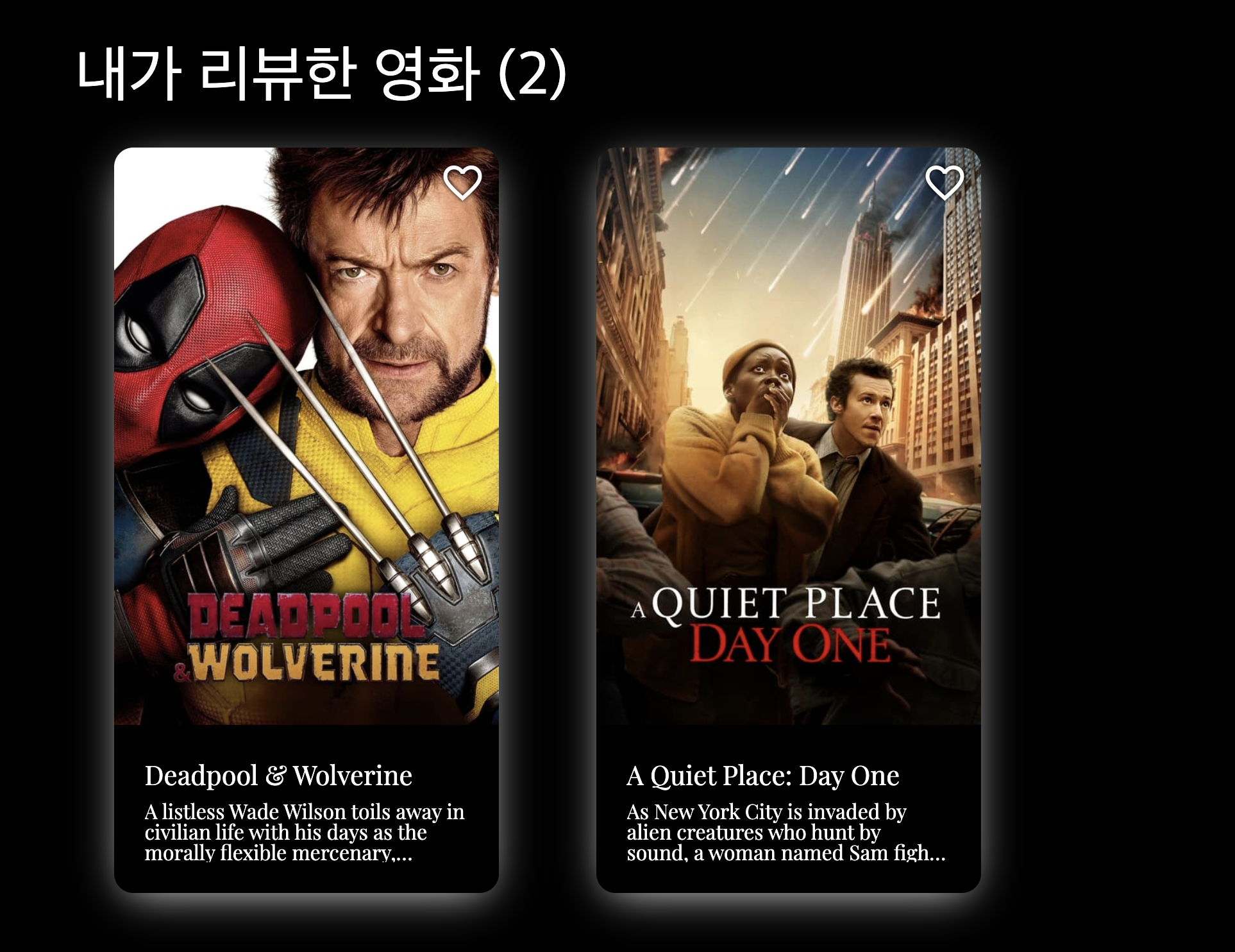 또 찜한 영화, 리뷰한 영화가 없는 경우 '찜한(리뷰한) 영화가 없습니다.'라는 문구를 출력하도록 하고 로그인하지 않은 상태에서 찜버튼을 눌렀을 때 로그인을 해달라는 alert 창을 띄우는 등 기획단계에서 고려하지 못한 부분들을 조금 더 채워나갔다.