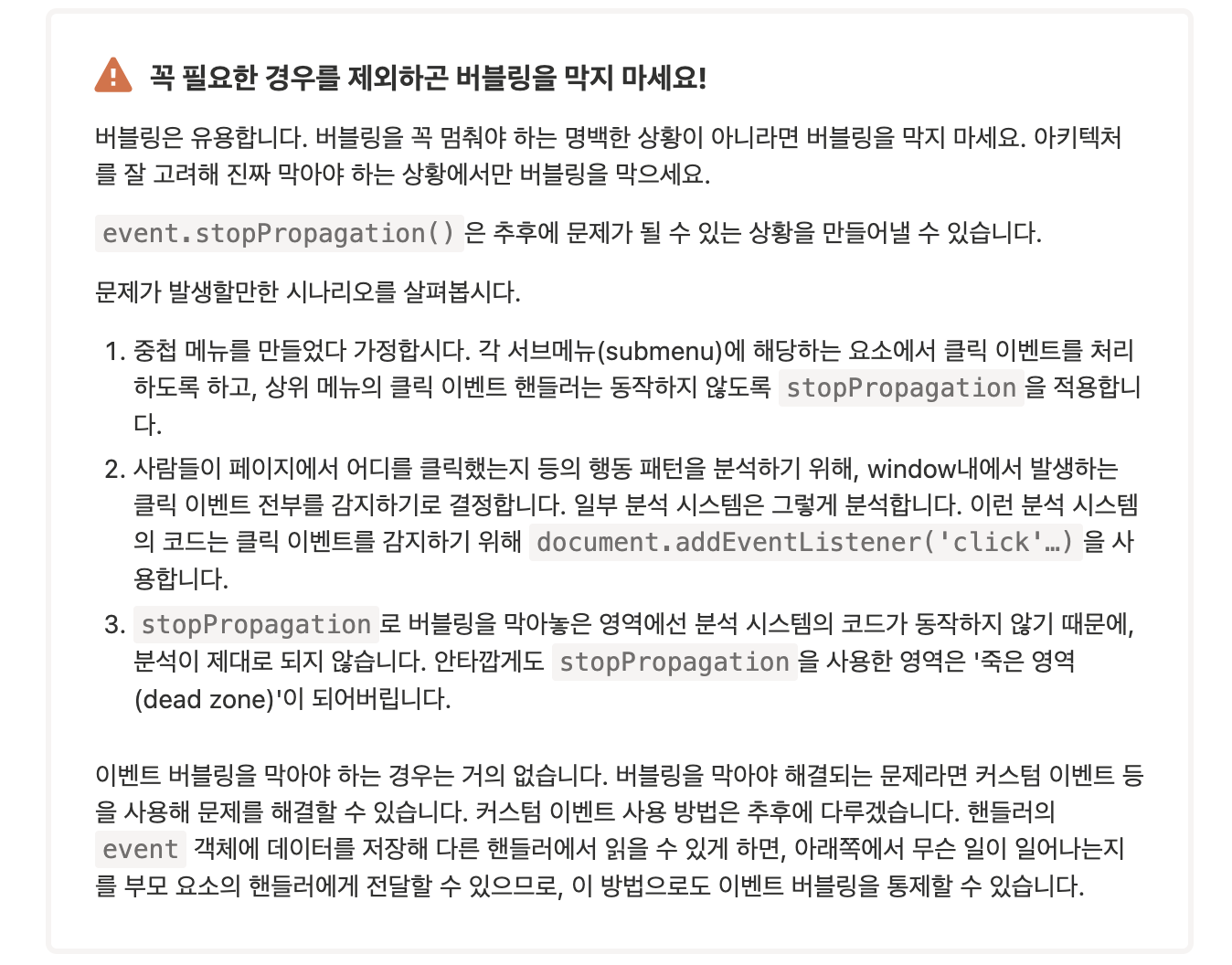 event.stopPropagation()을 통해 버블링을 막을 수 있지만, 알아보니 이는 추후 문제가 생기는 상황을 만들 수 있다고 한다.