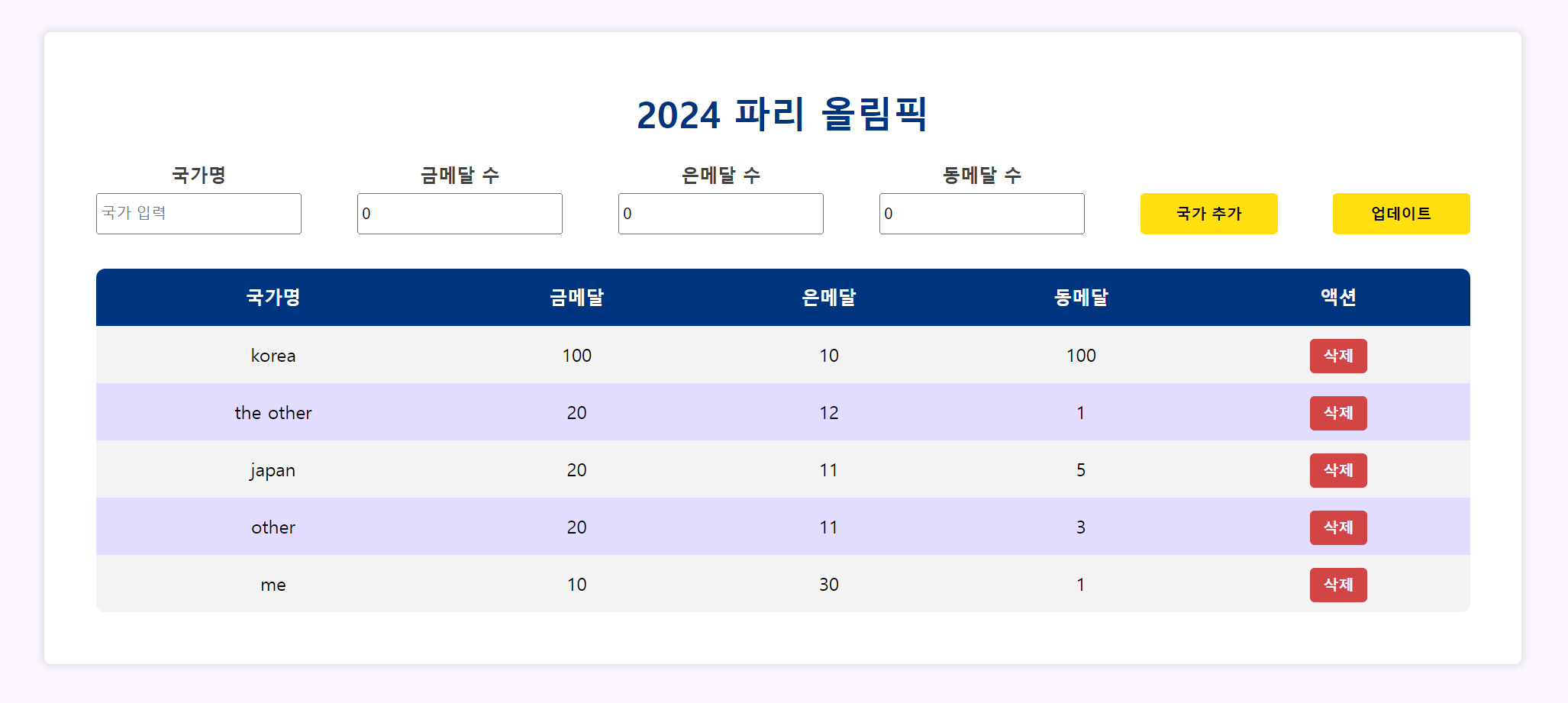 | [24.08.12] 개인프로젝트 4일차 - 올림픽 메달 트래커 만들기 (0) | 2024.08.12 |