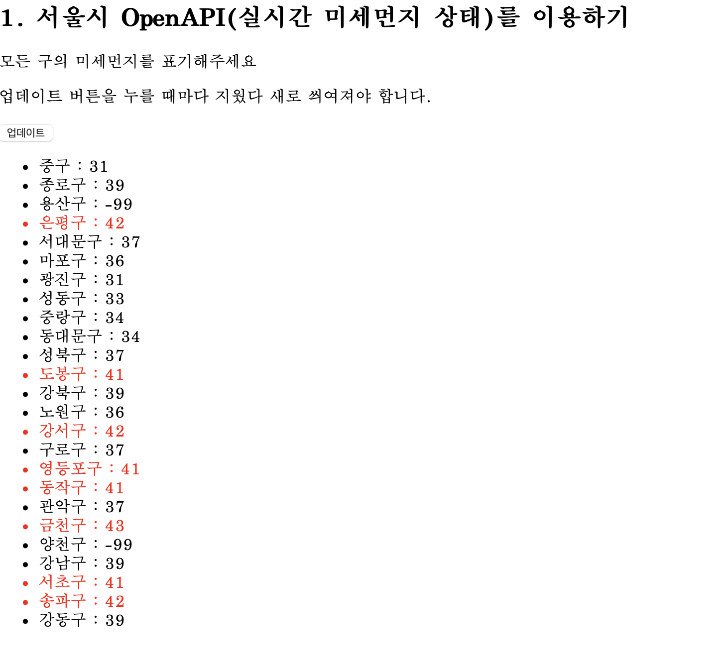 서울시 미세먼지 API를 활용한 fetch 실습 강의 수강 중 특정 조건에서 빨간 글씨로 출력하기 위해 아래와같은 코드를 사용하였다.